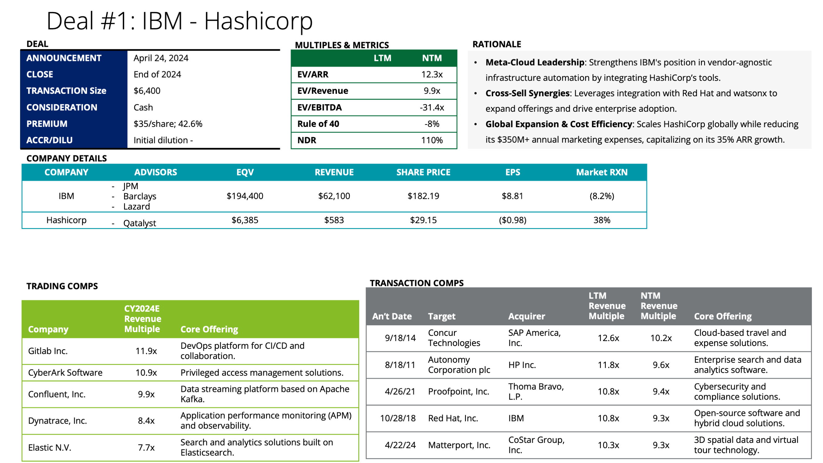 | Details | IBM acquired HashiCorp (April 2024) for $6.4bn, implying 12x EV/ARR and a 40% premium, in an all-cash transaction |
